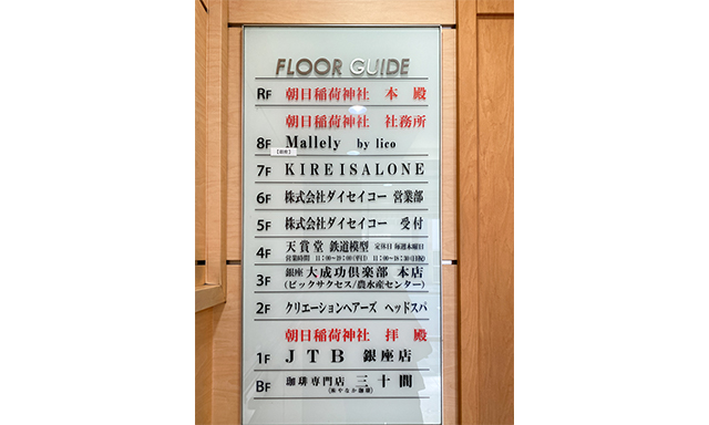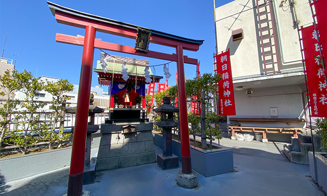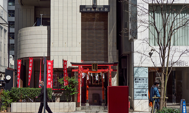 If you walk to the east along Matsuya Dori from the Ginza 3-chome intersection and pass by Oji Hall, you will find a small shrine on the first floor of a building on the corner of a small intersection. That is Asahi Inari.