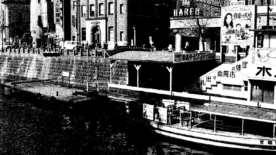 A water-bus ran along Shiodome river. Near Ginza 8-Chome in 1959.