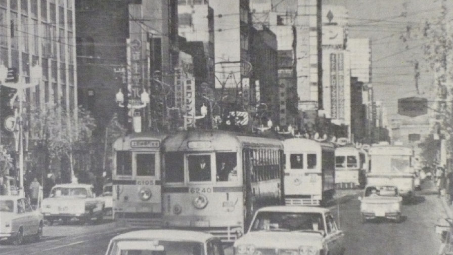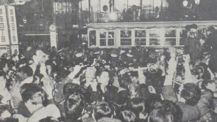 In 1967, the Toden streetcar Ginza line was finally shut down for good. Streetcar lines had crisscrossed Tokyo up until the mid-‘50s, acting as a valuable method of transportation. As motor traffic progressed and the number of automobiles on the roads increased, the trams ended up clogging traffic. The sight of trams running through Ginza -dori had already become a common feature of that area. On the night of December 9, the final night of the Toden streetcars, throngs of people filled Ginza-dori to reluctantly bid farewell to their beloved trams.