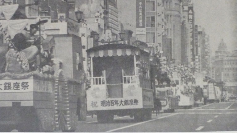 The year of 1968, the year the plans were completed, also marked 100 years after the start of the Meiji era. In Ginza, which had played an important role in the development of modern Japan with the building of the Meiji Bricktown, the “Meiji 100 Year Anniversary Grand Ginza Festival” was held in October of that year. The extremely glamorous festival, during which the district was colorfully decorated and light-covered cars drove in a parade down Ginza -dori, became a major Ginza event, and continued to be held annually with various themes each year until 1999.