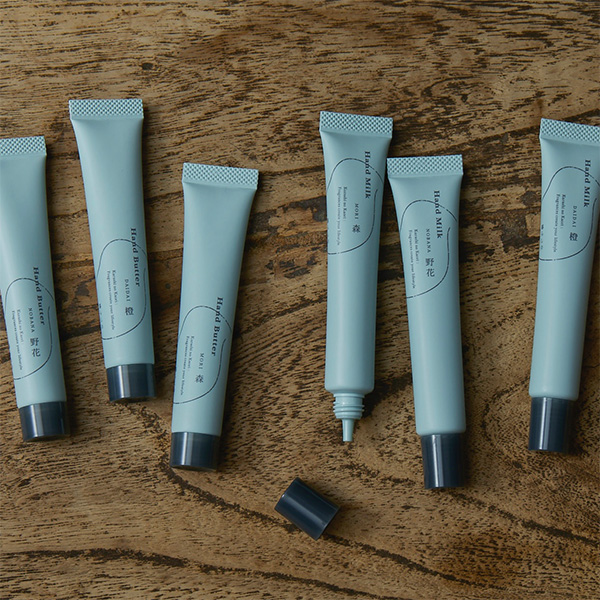 Hand care products are made with 100% natural essential oils. The hand butters, which have a rich texture, and the hand milks, which quickly absorb into your skin, are each available in three fragrances: the woody aroma of “Forest,” the floral aroma of “Nobana,” and the refreshing, citrusy aroma of “Daidai.”
