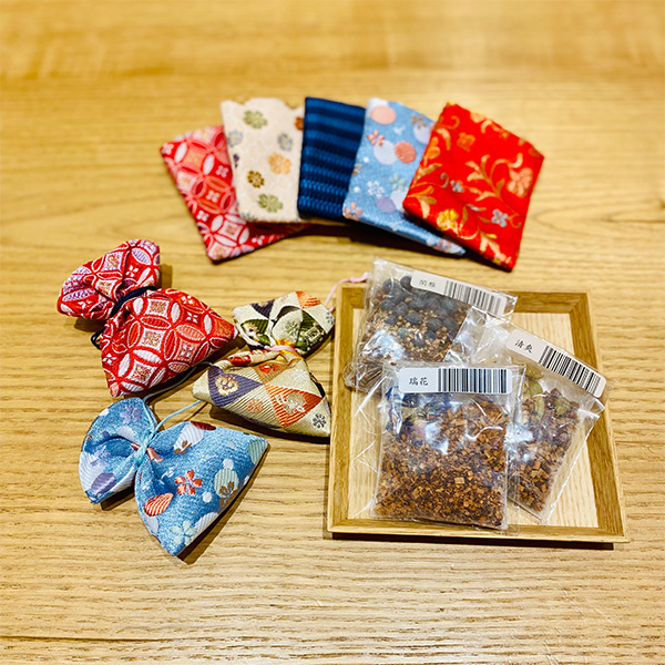 Sachets are available with your scent of choice and a dedicated bag made with the Kyoto Nishijin fabric you prefer. Traditional scents including cinnamon and white sandalwood are mixed with modern scents, such as rose and chai, to produce 6–7 different original scents that are new and innovative. Put them in a closet or slip one in your bag to enjoy elegant aromas in your daily life.