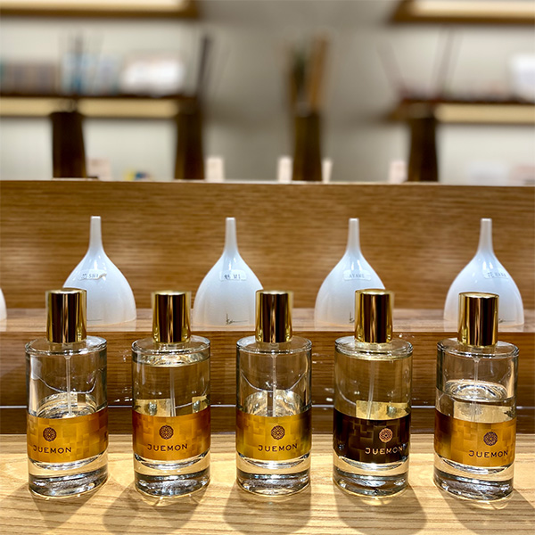 In the Edo period, the 8th-generation family owner of Koju, Juemon Takai was well known as a master of aromas. The original eau de toilette brand carries his name and expresses an exceptional world view evoking incense and trees. High-quality aromatic materials are used to produce appealing scents that are traditional and bold, yet quietly refined and clean. The understated Japanesque scents will enhance the experience of wearing a kimono.