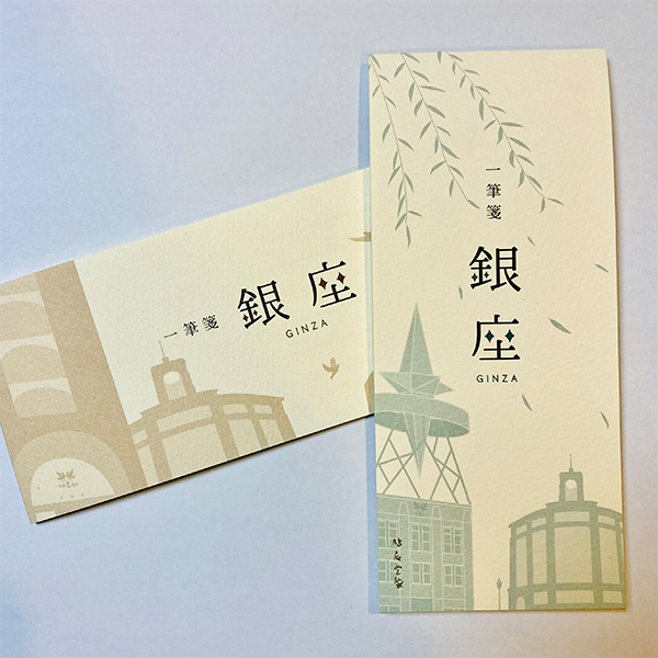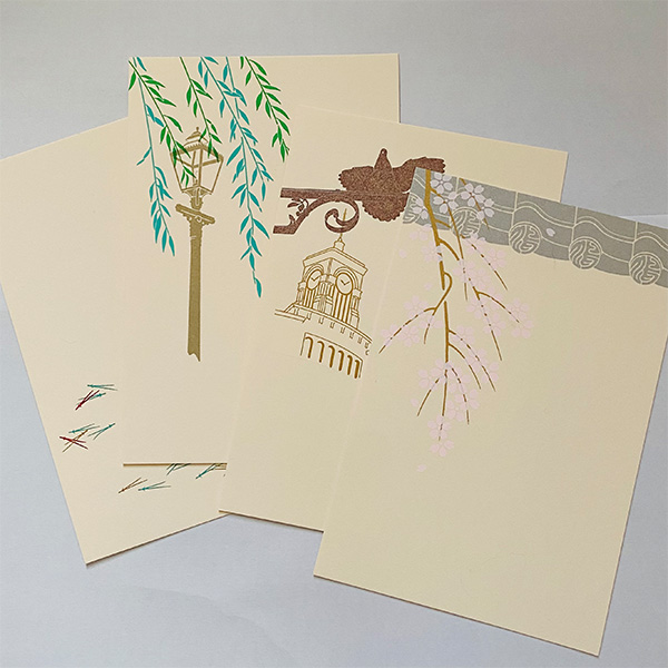 Enduringly popular postcards featuring colorful flowers and scenery in all four seasons are made using silkscreen printing. The 300 or so different prints are created by a designer who grew up in an ukiyoe printing shop. The sophisticated, serene appearance of the pale cream-colored postcards are enchanting. From the right is “Miyako,” “Ginza A,” “Ginza B,” and “Matsuba.”