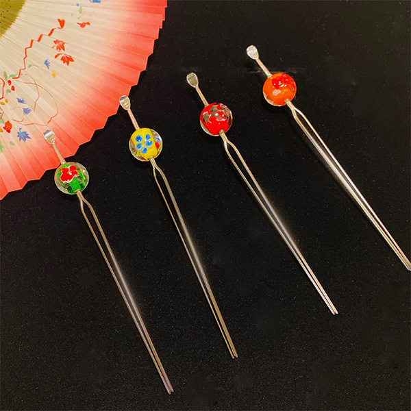 The hairpins are decorated with “tombo dama,” beautiful glass beads with a delicate design resembling dragonfly eyes. Tombo dama were popular among ordinary people in the Edo period. Not only were they used as stylish hairpins, but the tip was also said to have been used as an earpick. No two are alike, as each and every extravagant hairpin is handmade by a craftsperson. You’re sure to find one just right for you.