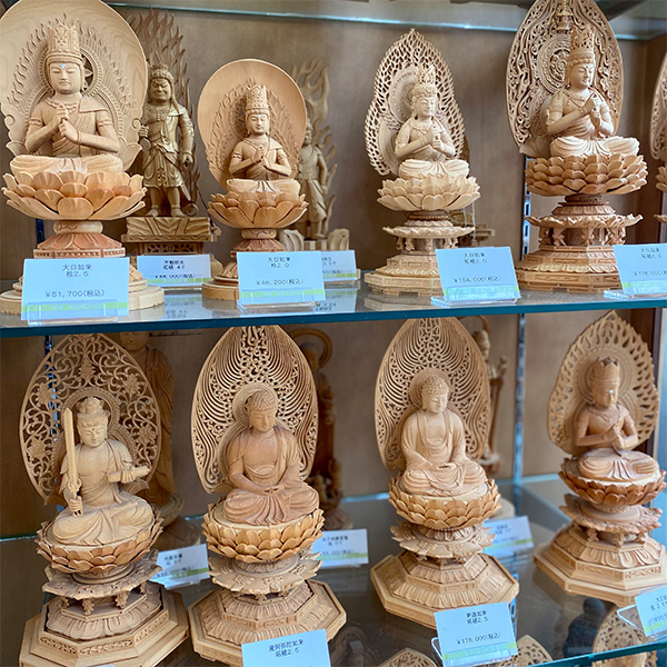 Various Buddhist images that include Dainichi Buddha, the historical Buddha, and Amida Buddha are especially popular with Asian tourists. The intricate Buddhist images are created by artisans out of Japanese cypress, Japanese boxwood, or the scarce white sandalwood. Many people apparently purchase them as artworks they appreciate, regardless of religious sect.