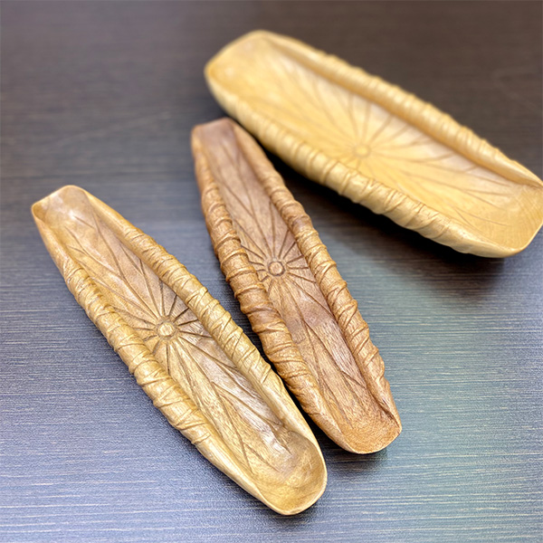 These dishes with lotus leaf and flower motifs, which are associated with Buddhism, can be used for many things. They differ slightly in appearance from one another since each amazing dish is handcrafted by an artisan out of Japanese zelkova. They are recommended for holding pens or small articles.