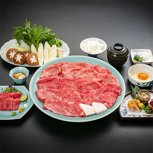 Sukiyaki course 20,000 yen. Includes highest-grade ribeye core (150g), along with an appetizer, assorted hors d’oeuvres (4 items), Yamagata’s local chilled soup, rice, miso soup, pickles, dessert, and coffee.