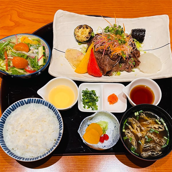 One of the most popular choices is the “Special A5 Wagyu Mizore-yaki,” which lets you savor a variety of A5 Wagyu cuts all at once. Lightly dipping the Wagyu into two sauces—mellow shio-kōji ponzu and classic ponzu—brings out the richness of the fat with a refreshing flavor that keeps you coming back bite after bite. It pairs perfectly with the colorful assortment of vegetables! Even at lunch, you can fully enjoy the charm of A5 Wagyu beef.