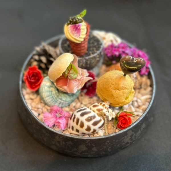 Appetizers include a tartare of Kobe beef topped with sea urchin cream, presented to resemble gelato; a monaka wafer filled with Hakkaisan sake lees, mascarpone cheese, and prosciutto; and a playful amuse of choux pastry stuffed with foie gras mousse and fig compote, finished with an injection of vincotto sauce. Each piece, small enough to be taken by hand, unites visual elegance with exquisite taste—culinary art at its finest.