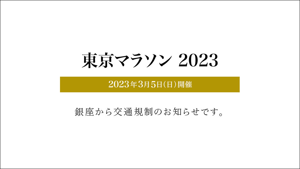 On the day of the Tokyo Marathon, special traffic regulations will be enforced in Ginza. We apologize for the inconvenience to those accessing the area by vehicle and to all pedestrians through the area, and greatly appreciate your cooperation. Note: For detailed information on traffic regulation...