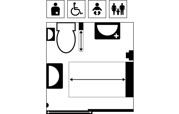 Equipment:Western-style toilet/Sink/Ostomate sink/Baby seat/Vertical folding changing table/Vertically adjustable grab bar/Towel/Dustbin/Flush button/Warm water wash button/Emergency call button/Door opening/closing button