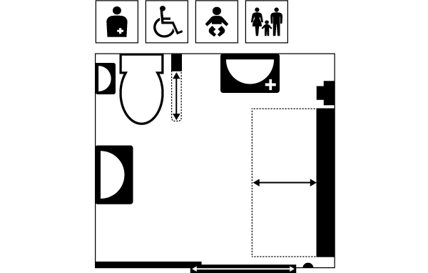 | Equipment: | Western-style toilet/Sink/Ostomate sink/Baby seat/Side folding changing table/Vertically adjustable grab bar/Towel/Dustbin/Flush button/Warm water wash button/Emergency call button/Door opening/closing button |