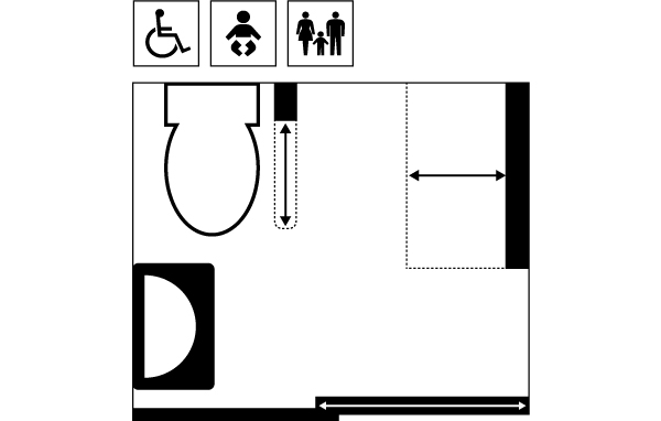 | Equipment: | Western-style toilet/Sink/Side folding changing table/Vertically adjustable grab bar/Dustbin/Flush button/Warm water wash button |