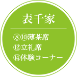 When Sotan, grandson of Sen Rikyu, handed over the headship of the Sen family to his third son, Sosa Koshin, he moved to a tea-ceremony house at the back of the premise with his fourth son, Soshitsu Senso. That was the start of Urasenke, and his successors served the Maeda family of the Kaga Province and the Matsudaira family of Matsuyama in Shikoku. Based on the spirit of the Four Principles of Tea (harmony, respect, purity and tranquility) maintained since Sen Rikyu’s time, Urasenke carefully nurtures the relationships between people. For the Kyoto Exposition (1871), Seishu Gengensai, the 11th head of Urasenke created the “ryureishiki” style of tea ceremony that allowed foreigners and others not used to kneeling in the seiza position to sit on chairs accompanied by a special table. He thus strove to popularize and further develop tea ceremony culture in line with the times, while carefully preserving its traditions. The 16th head, Zabosai, is actively spreading the “heart of tea” widely to schools and workplaces and carrying out activities to nurture new tea ceremony students and clearly define tea ceremony culture.