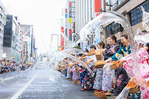 At locations on Ginza-dori (4 spots), water will be splashed on the street in unison to the beat of a drum.