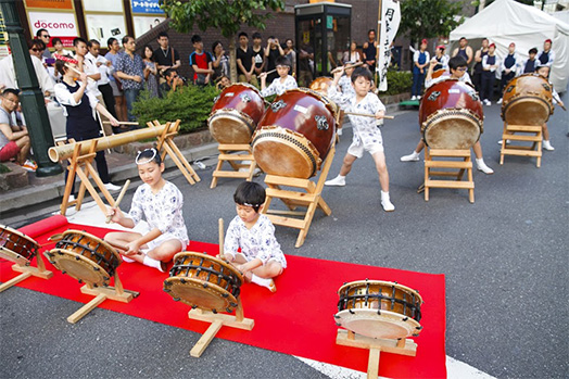 Powerful wadaiko (Japanese drum) performance that blows the heat of summer away. Enjoy the beats by members of Tsukishima Gojin Daiko that gives performances by not only men, but also women and children.