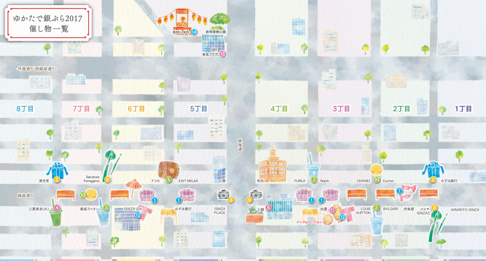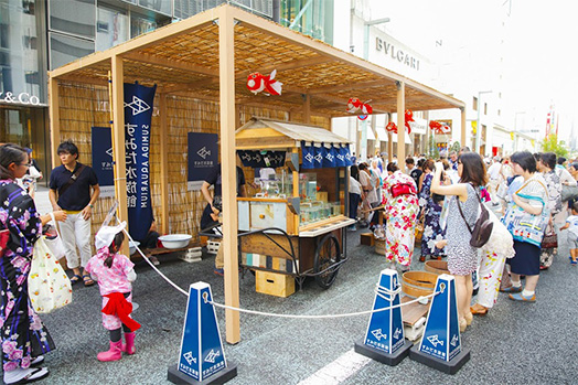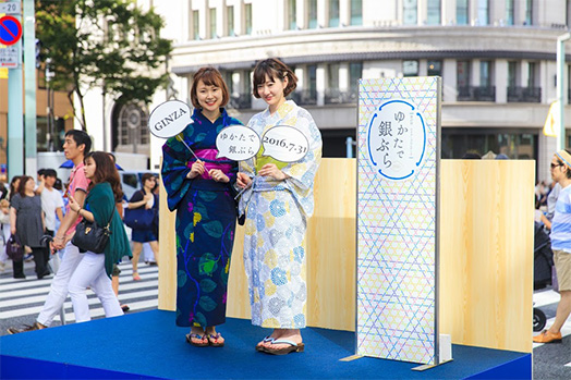 Yukata de Gin-bura Festival 2017 is a project that turns Ginza-dori from 1-chome to 8-chome into a vehicle-free promenade on Sunday, August 6. All types of “cooling off” events that showcase Japanese hospitality will be held for people visiting midsummer Ginza wearing yukatas and other Japanese clothing.